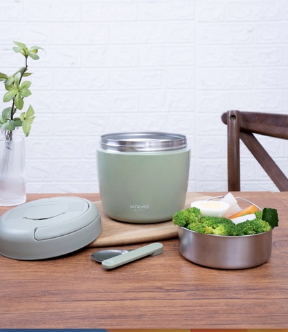 - Cặp lồng giữ nhiệt Kaiyo làm từ chất liệu inox 304 an toàn sức khoẻ, được trang bị công nghệ giữ nhiệt chân không hiện đại, nắp có gioăng silicone kín khít nên giúp giữ nhiệt nóng/lạnh lên đến 8 giờ. Cặp lồng được thiết kế 2 tầng đựng thực phẩm kèm theo 01 thìa inox gấp gọn, có quai xách tiện lợi, thích hợp cho việc mang nhiều loại thức ăn như chè cháo, bún, miến, phở cơm... đi làm, đi du lịch.