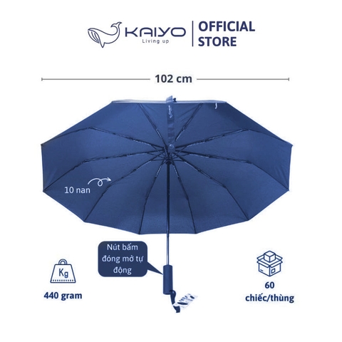 Ô gấp gọn tự động 2 chiều Kaiyo có khung gồm 10 nan được làm bằng kim loại và sợi thủy tinh cao cấp, tán ô được lợp bằng vải pongee độ bền cao nên ô có trọng lượng siêu nhẹ nhưng rất chắc chắn, có thể chịu được sức gió đến cấp 8 mà không bị lật. Ô có cơ chế đóng mở tự động bằng một nút bấm nên quá trình sử dụng rất thuận tiện và nhanh gọn.