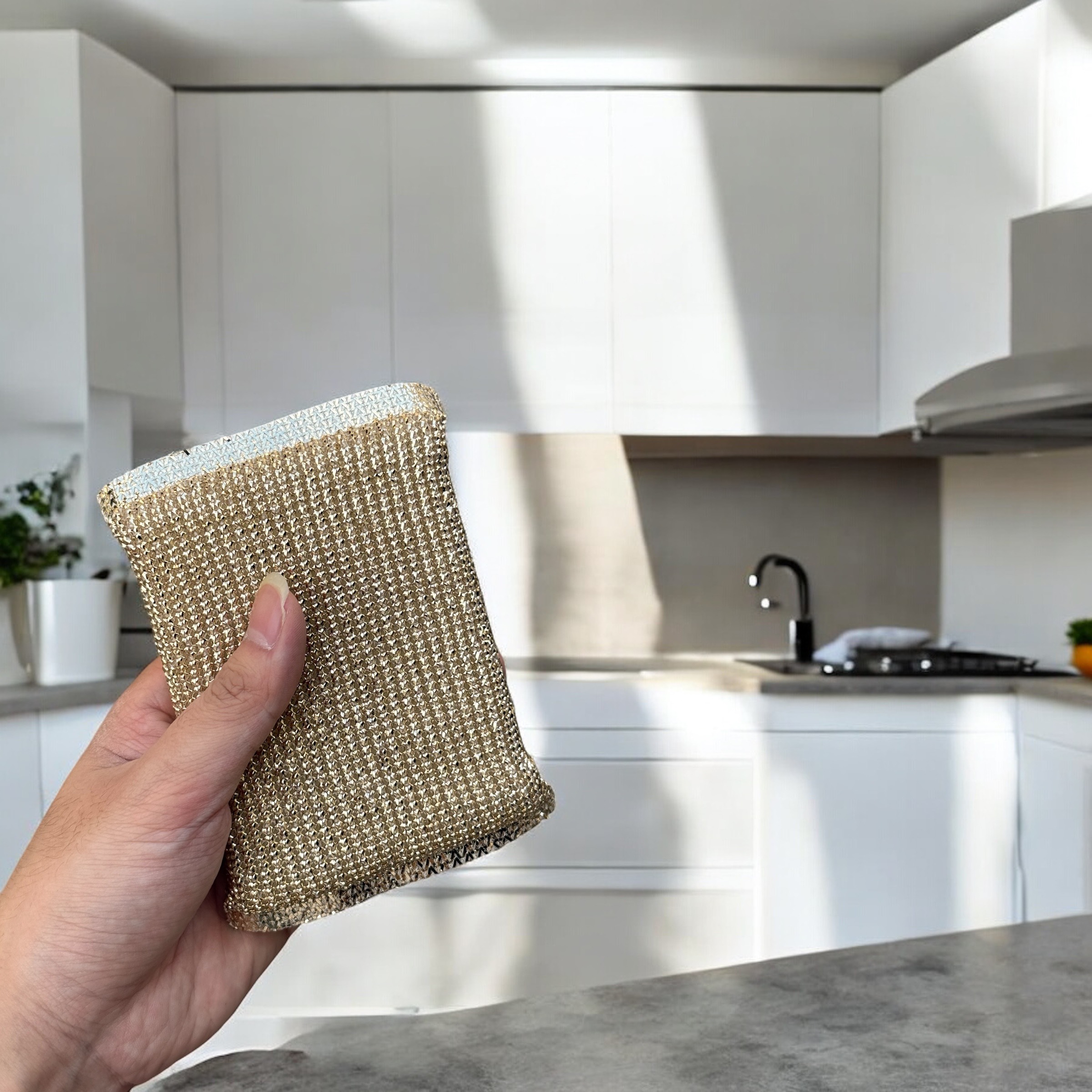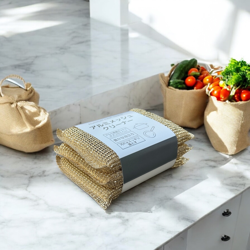 - Công dụng: dùng để chà cọ xoong nồi. Mỗi miếng gồm các sợi nhôm và vải PE bọc ngoài, phần mút xốp bọc bên trong giúp vừa lau chùi vừa cọ rửa các vết bẩn bám dính trên xoong, nồi đồ dùng nhà bếp 1 cách nhanh chóng dễ dàng mà ko làm trầy xước xoong nồi.